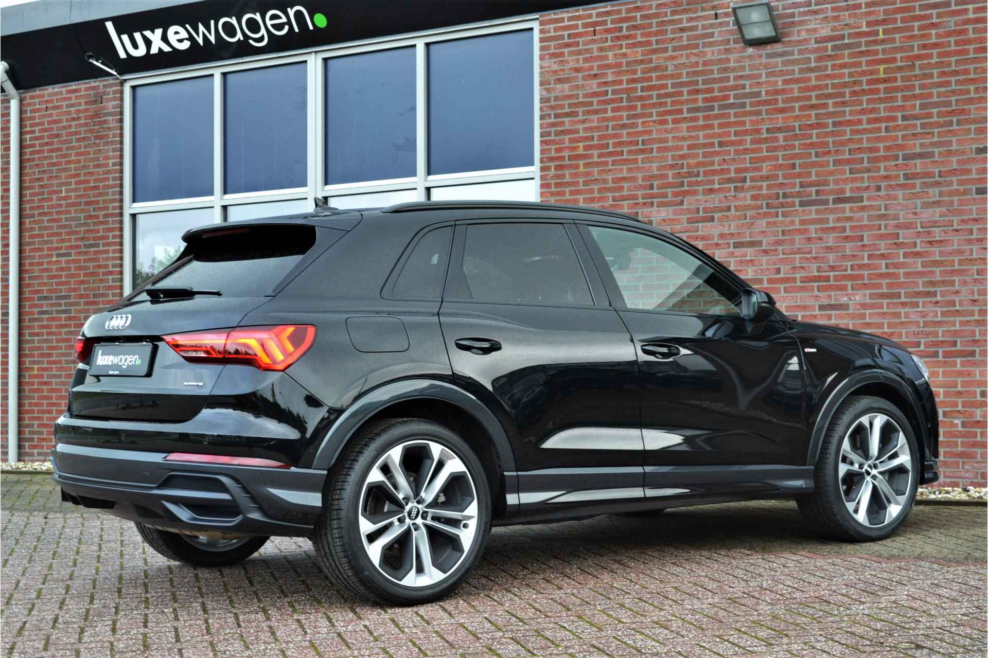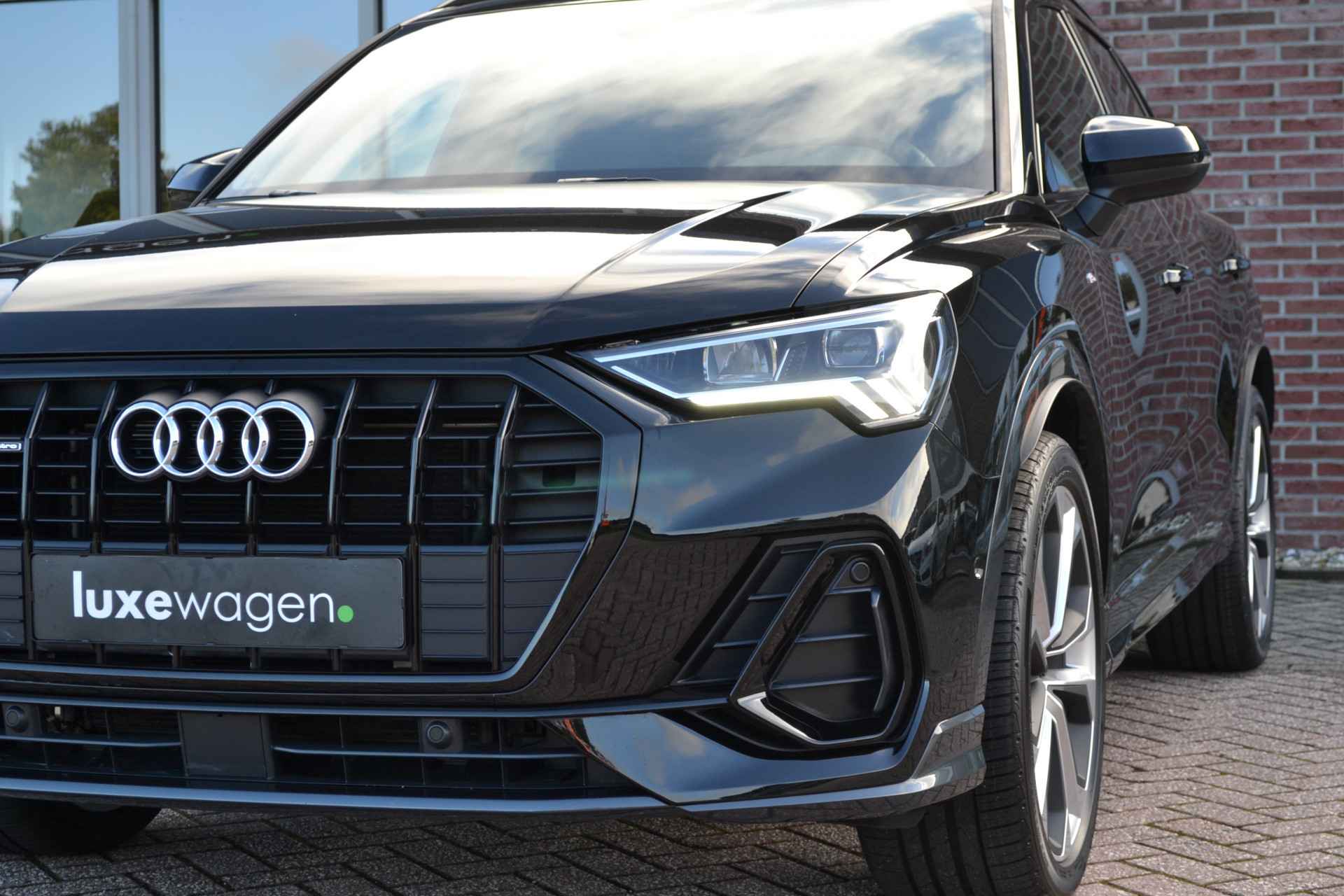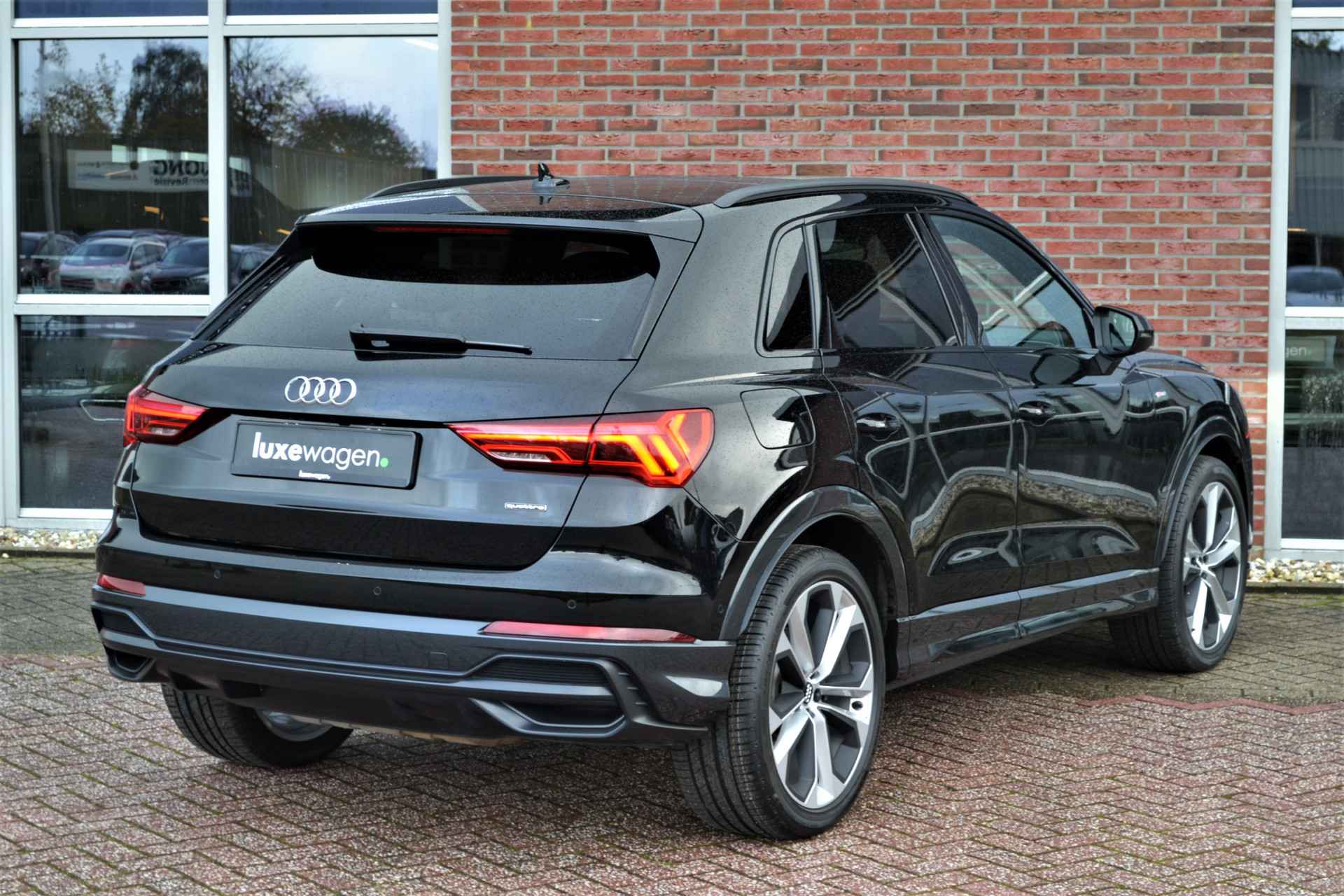 Perfect samengestelde Q3 40 (2.0L) TFSI quattro met 190pk. Nieuwprijs eur. 78.100,-. Met S-Line interieur en exterieur, panoramadak, matrix-LED met lopende knipperlichten, adaptieve cruise control, achteruitrijcamera, glanspakket zwart (optic black), lane- en side assist, etc!