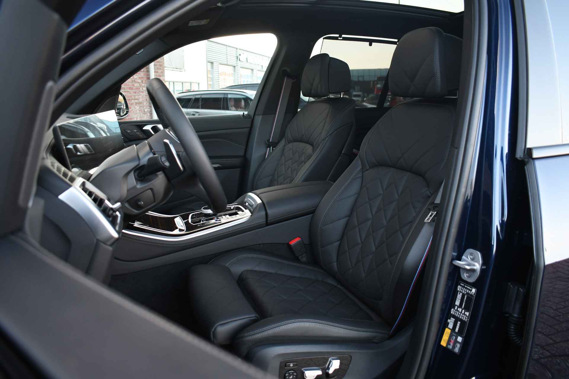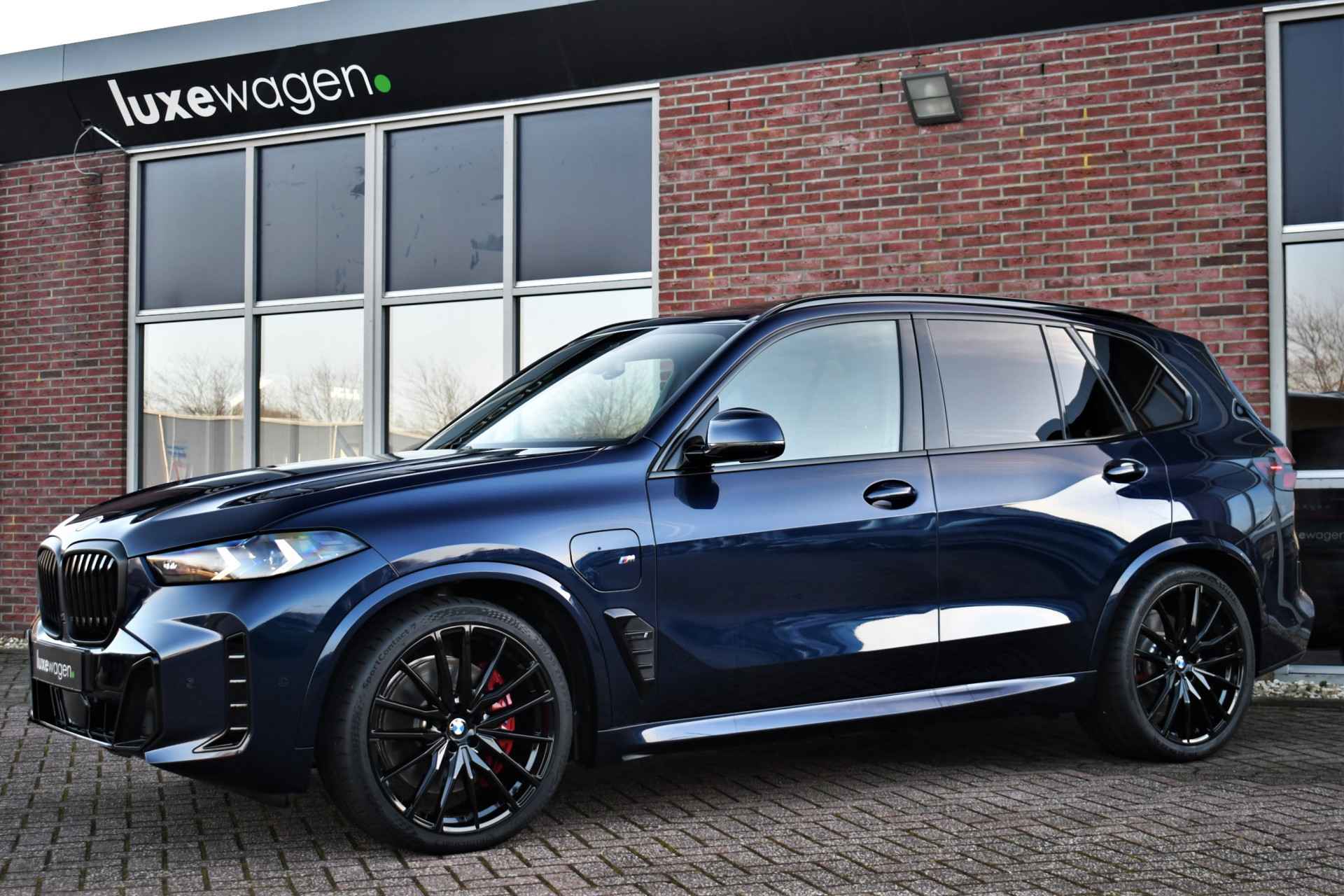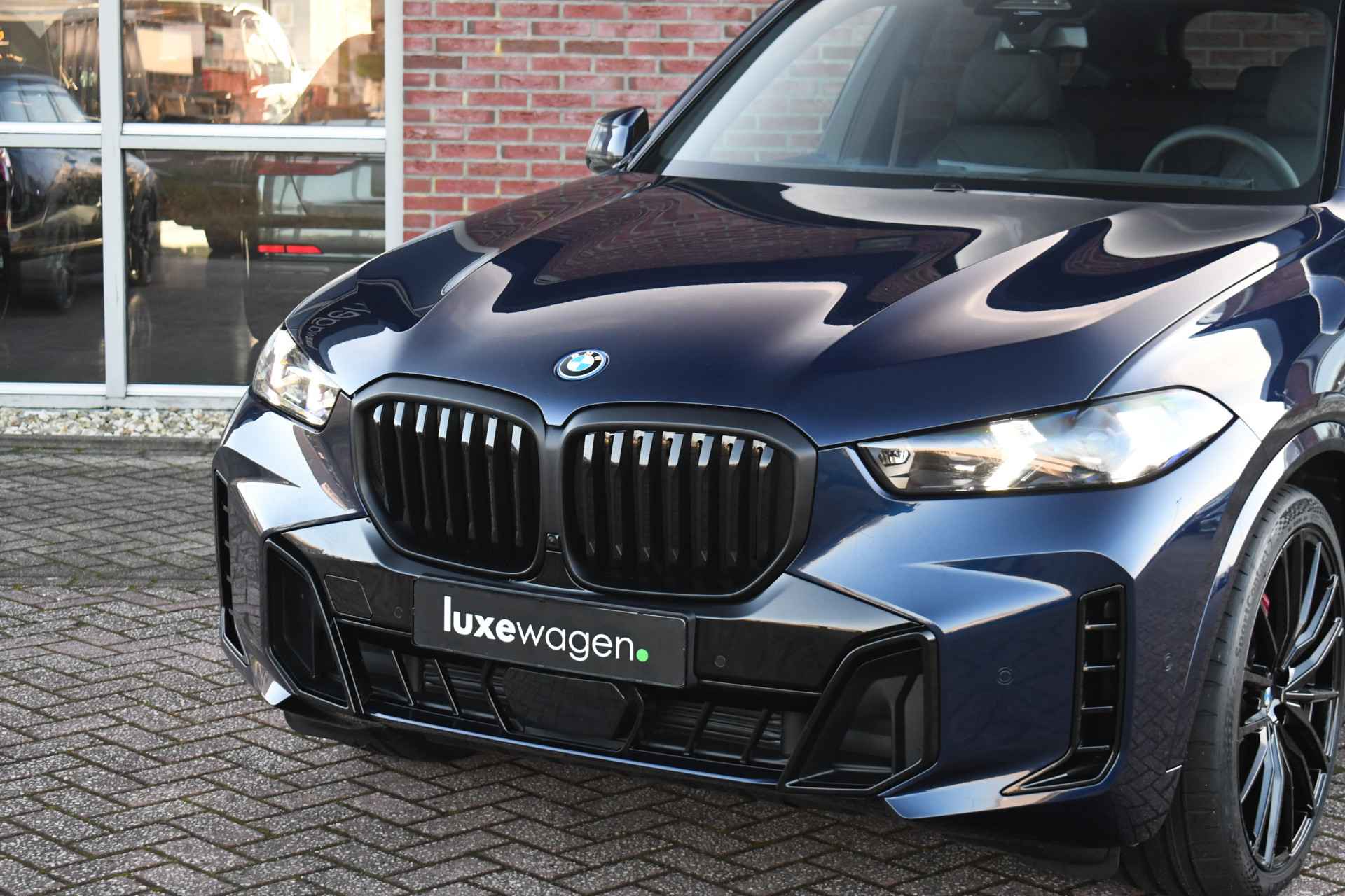 Deze nieuwe X5 xDrive50e staat in onze showroom en is direct leverbaar. Perfecte kleurcombinatie in Tanzanitblauw met zwart leder met ruitstiksel. Compleet met: - M-Sport Pro pakket (rode remklauwen, verlichte grille, M-gordels, compleet shadowline incl koplampen), - Exclusive pakket (massage, leder dashboard, glazen pook), - Innovatie pakket (harman/kardon, head-up, driving ast. prof met oa. adaptieve cruise, parking ast. prof met 360 camera), - Tavel pack (panoramadak en zonneschermen), - comfortstoelen met ventilatie en massage, - elektrische trekhaak, - 21 inch velgen Y-spaak, - luchtvering rondom. Zie optielijst voor de exacte specificaties! Direct leverbaar!