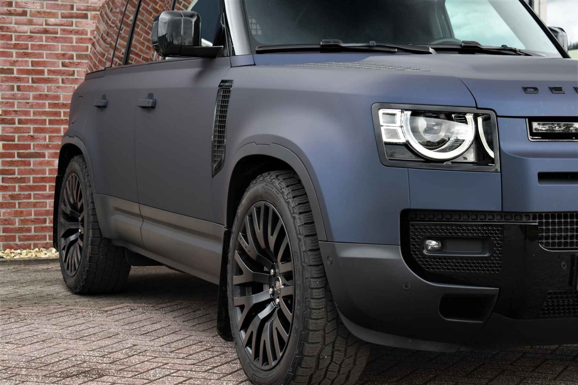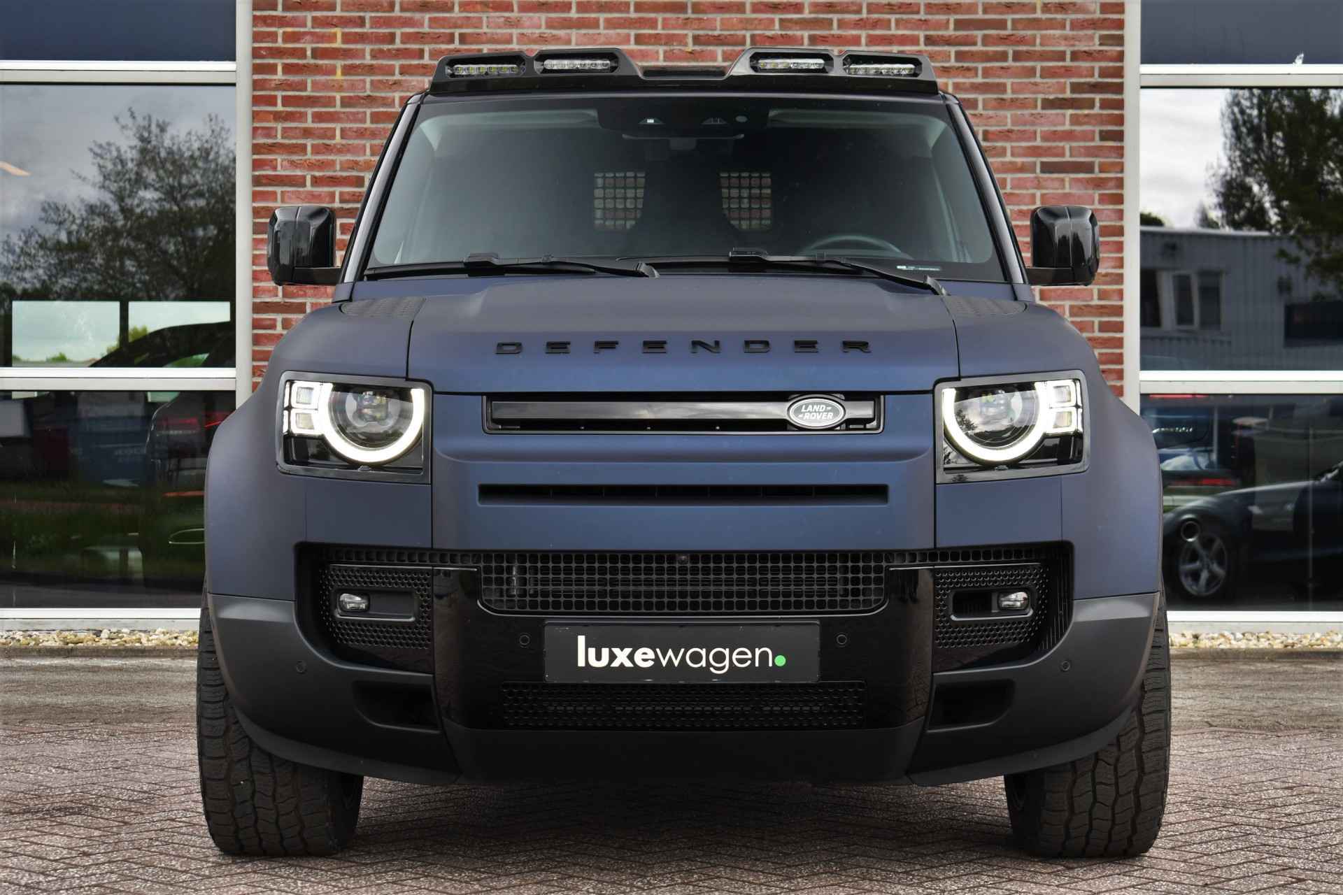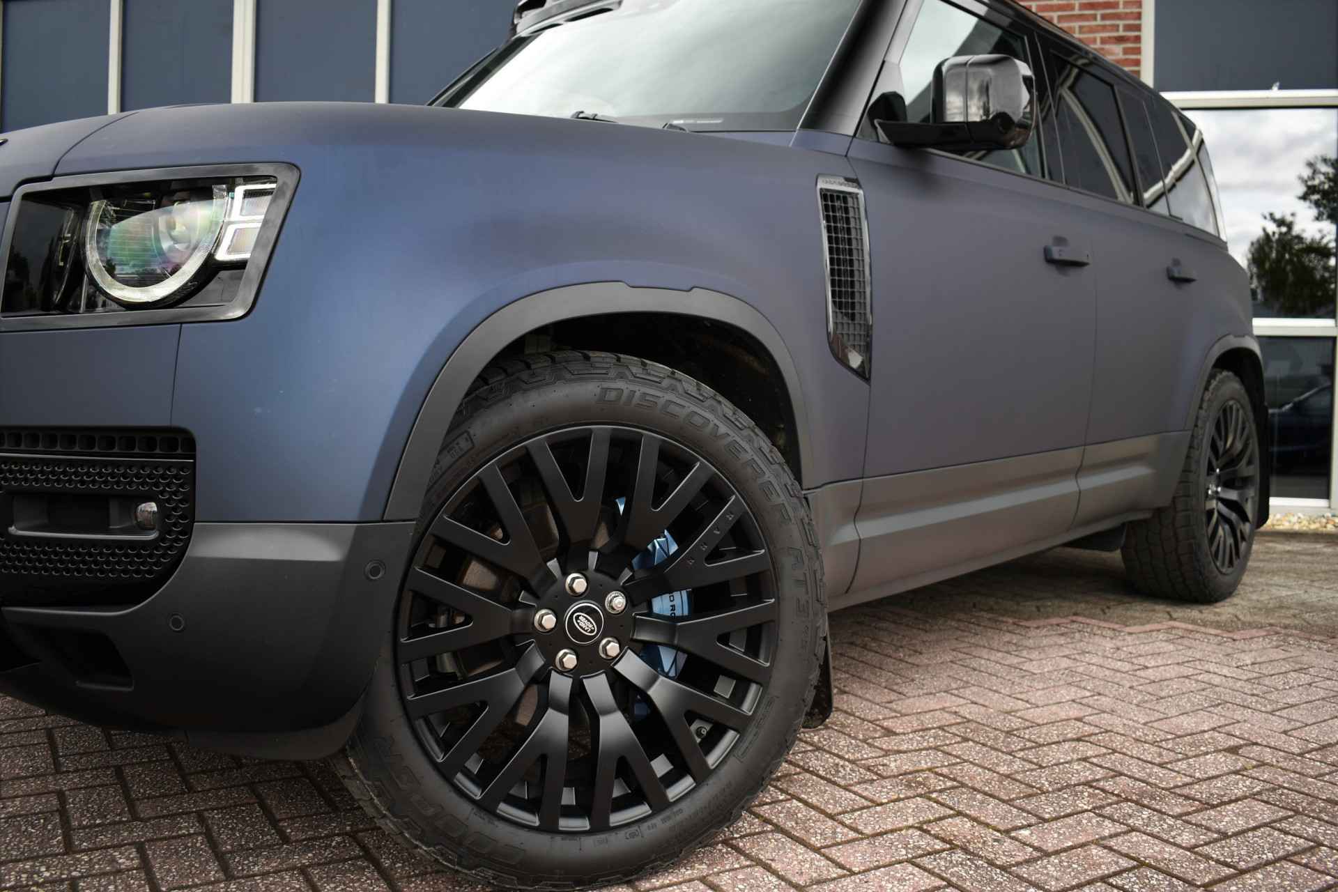 Unieke Defender 110 Hard Top met de 300pk sterke 6-cilinder dieselmotor. Prijs is exclusief BTW. Grijs kenteken, wegenbelasting slechts ca 60,- p/mnd. Compleet met 22 inch Kahn velgen, mat blauwe wrap (fabriekskleur Tasman blue), elektrische trekhaak, luchtvering, 3-persoons, camera binnenspiegel, etc!