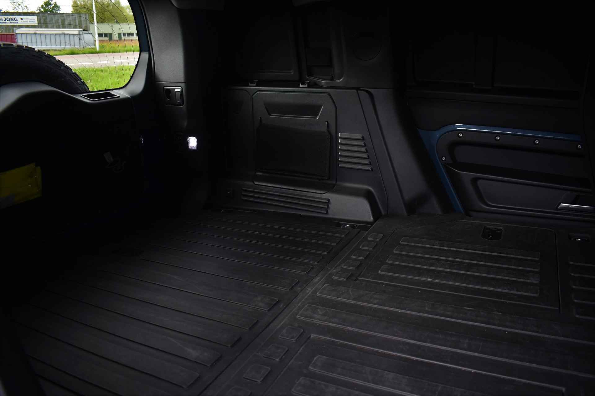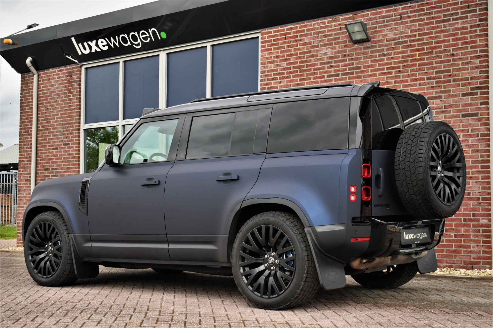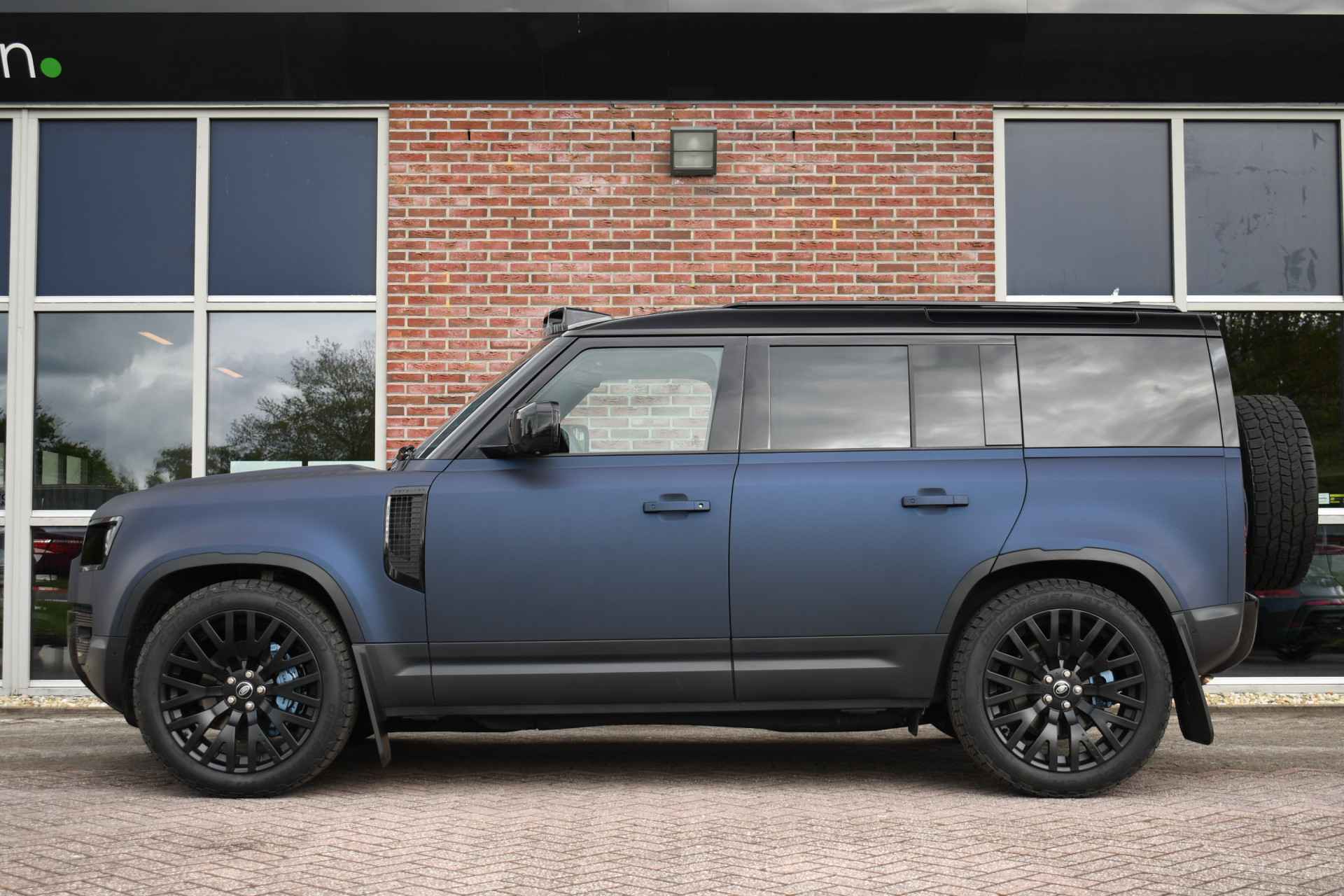 Unieke Defender 110 Hard Top met de 300pk sterke 6-cilinder dieselmotor. Prijs is exclusief BTW. Grijs kenteken, wegenbelasting slechts ca 60,- p/mnd. Compleet met 22 inch Kahn velgen, mat blauwe wrap (fabriekskleur Tasman blue), elektrische trekhaak, luchtvering, 3-persoons, camera binnenspiegel, etc!
